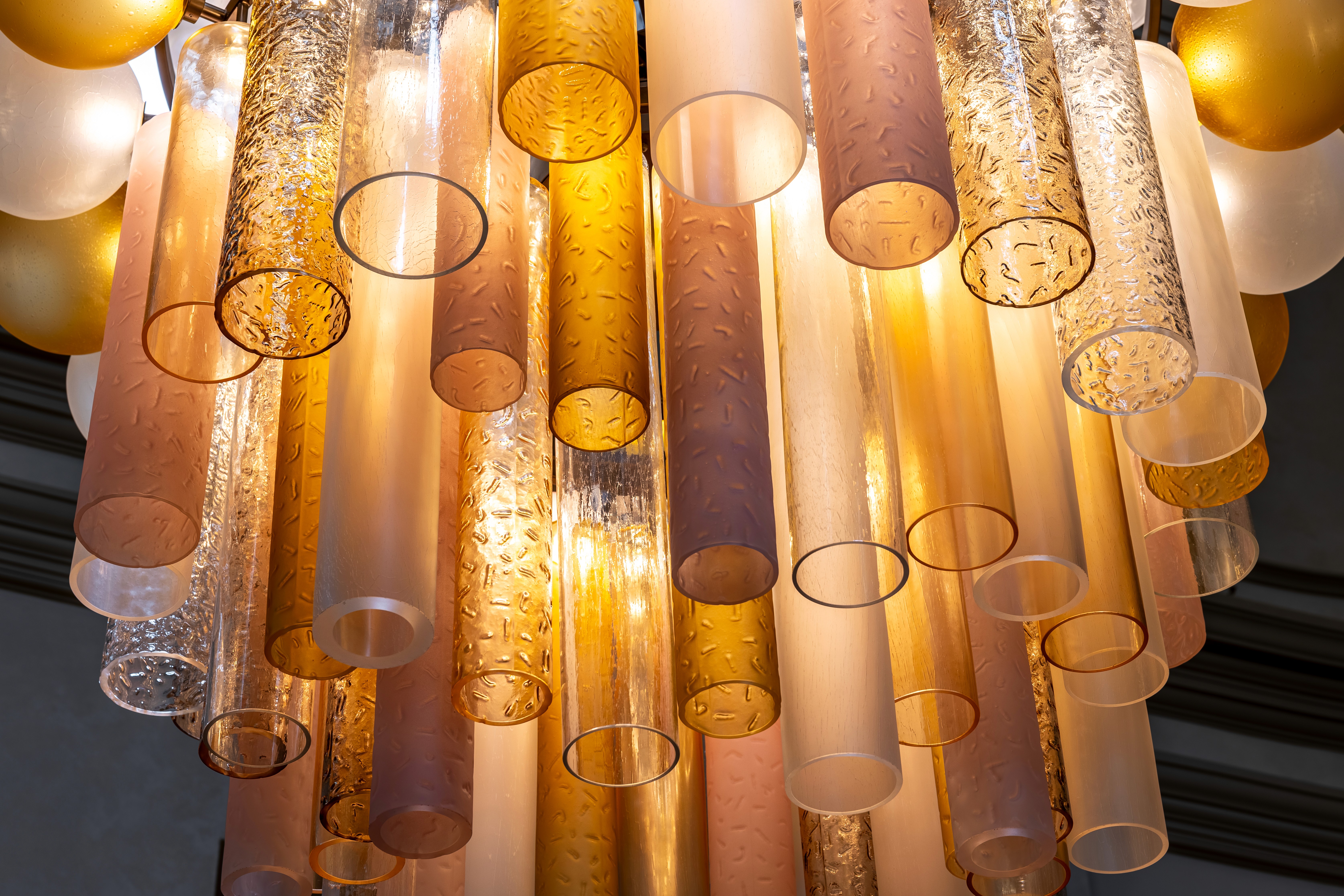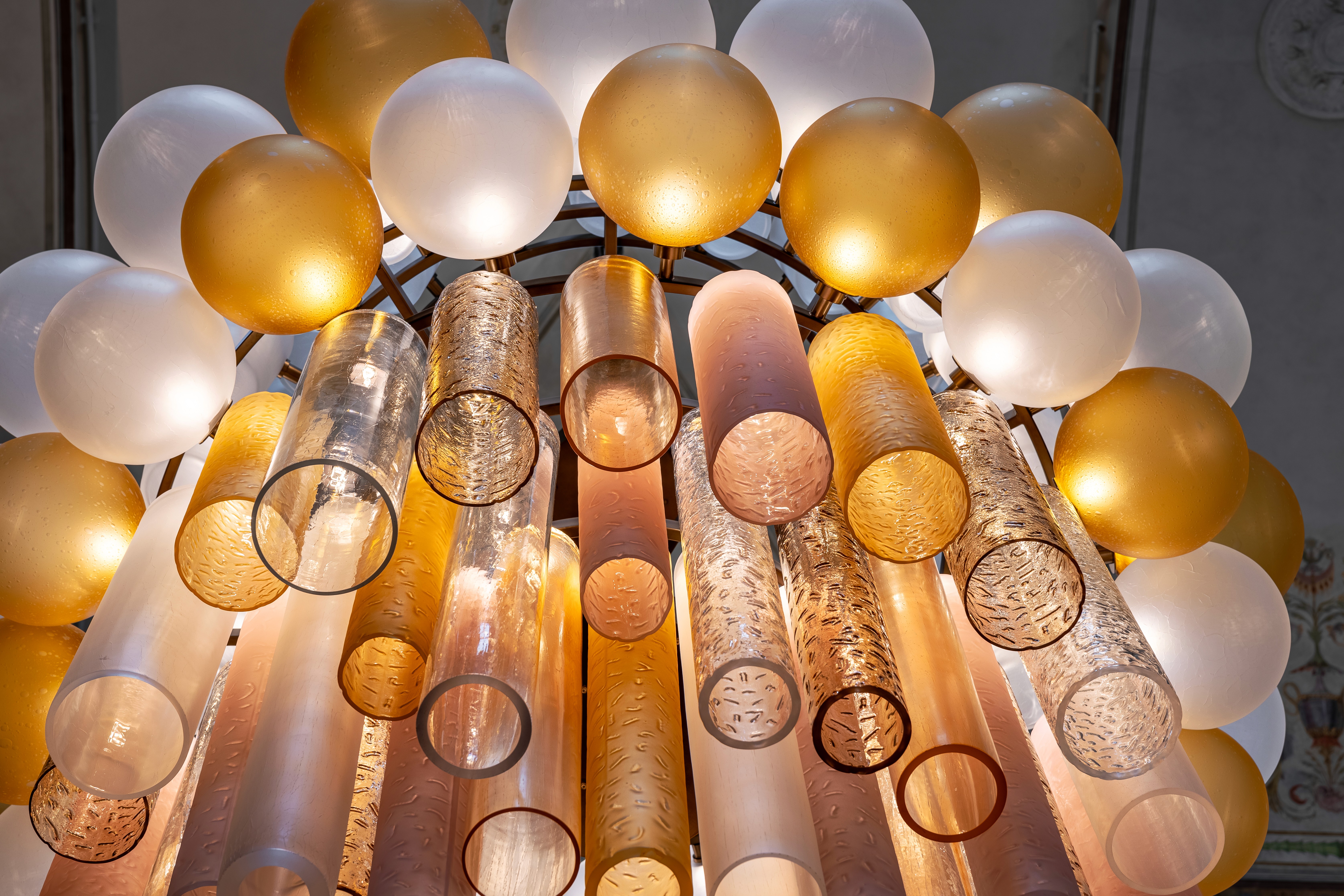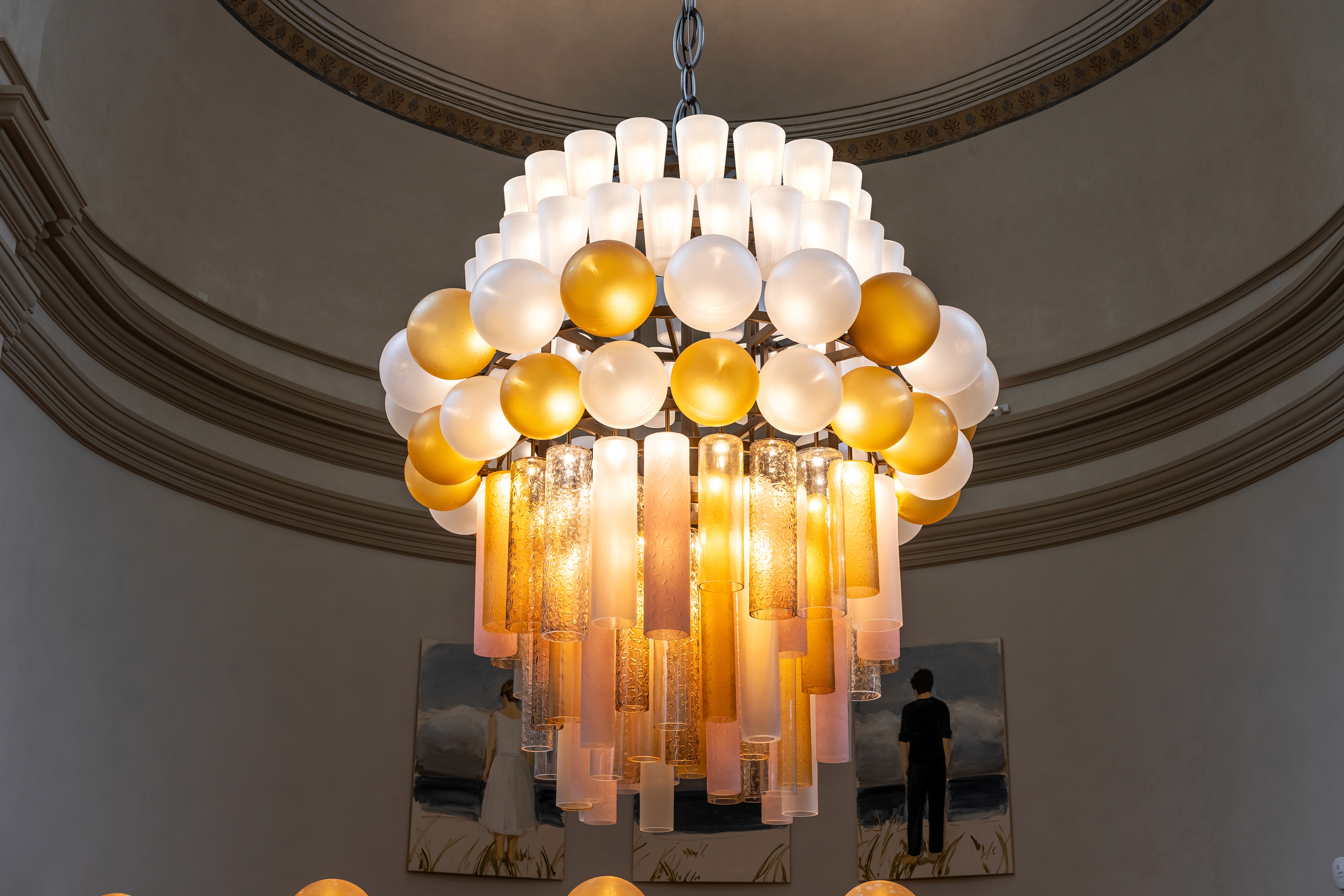 It was essential to honor the historic elegance of the space while introducing a modern, visionary touch. The chandelier combines warm brown and soft cream tones with contrasting cylindrical and spherical forms, capturing the timeless character of this remarkable setting.