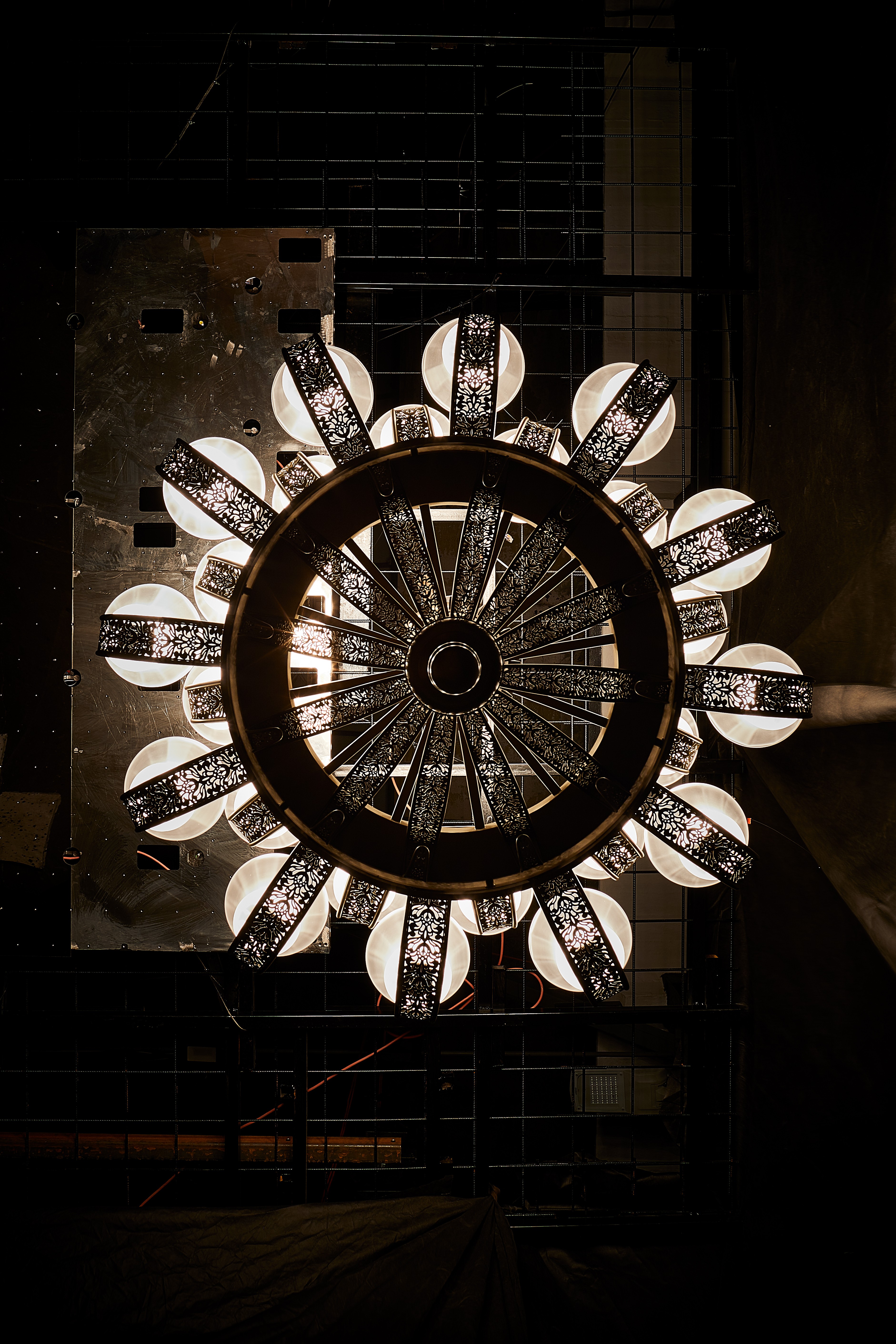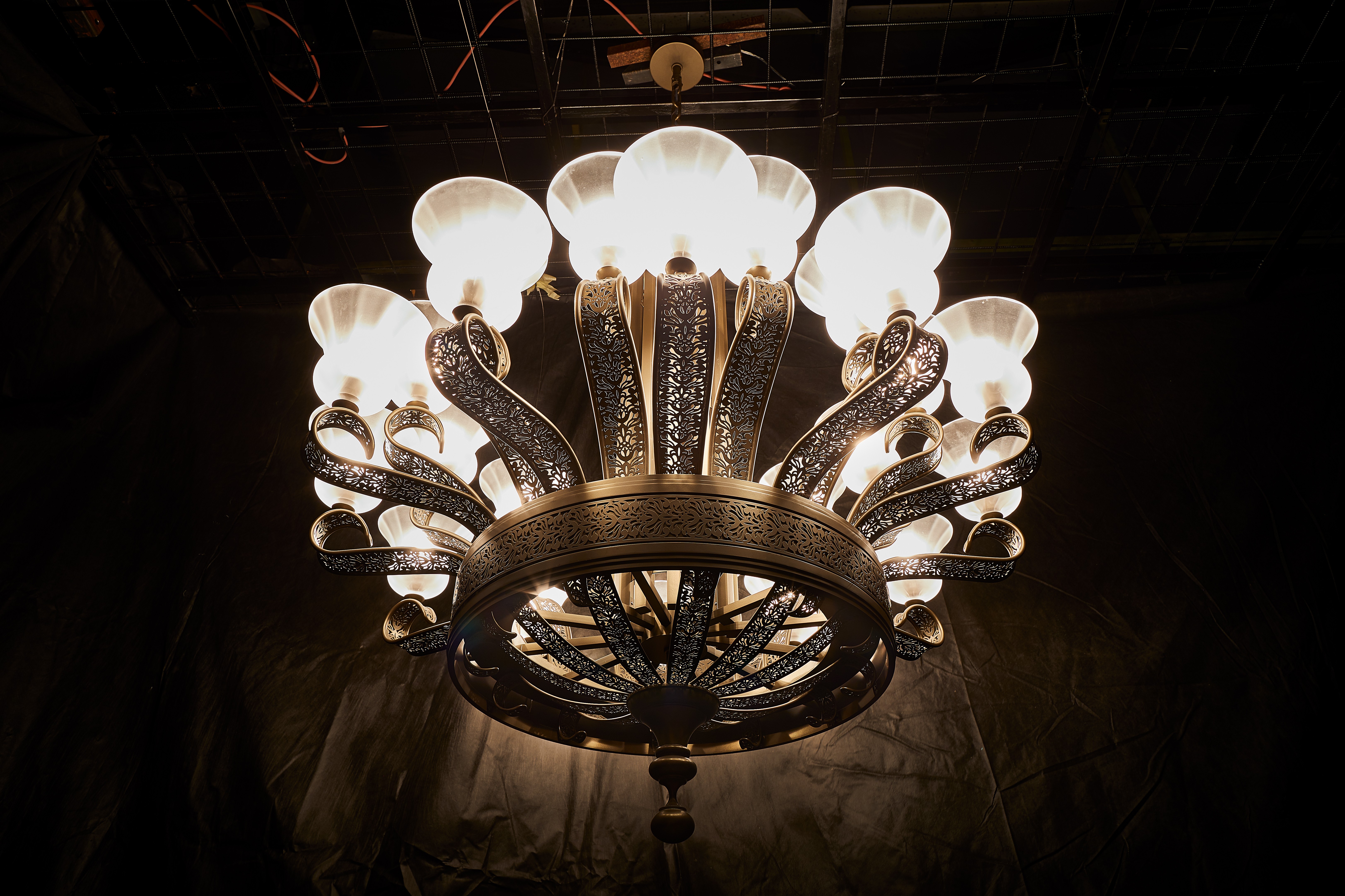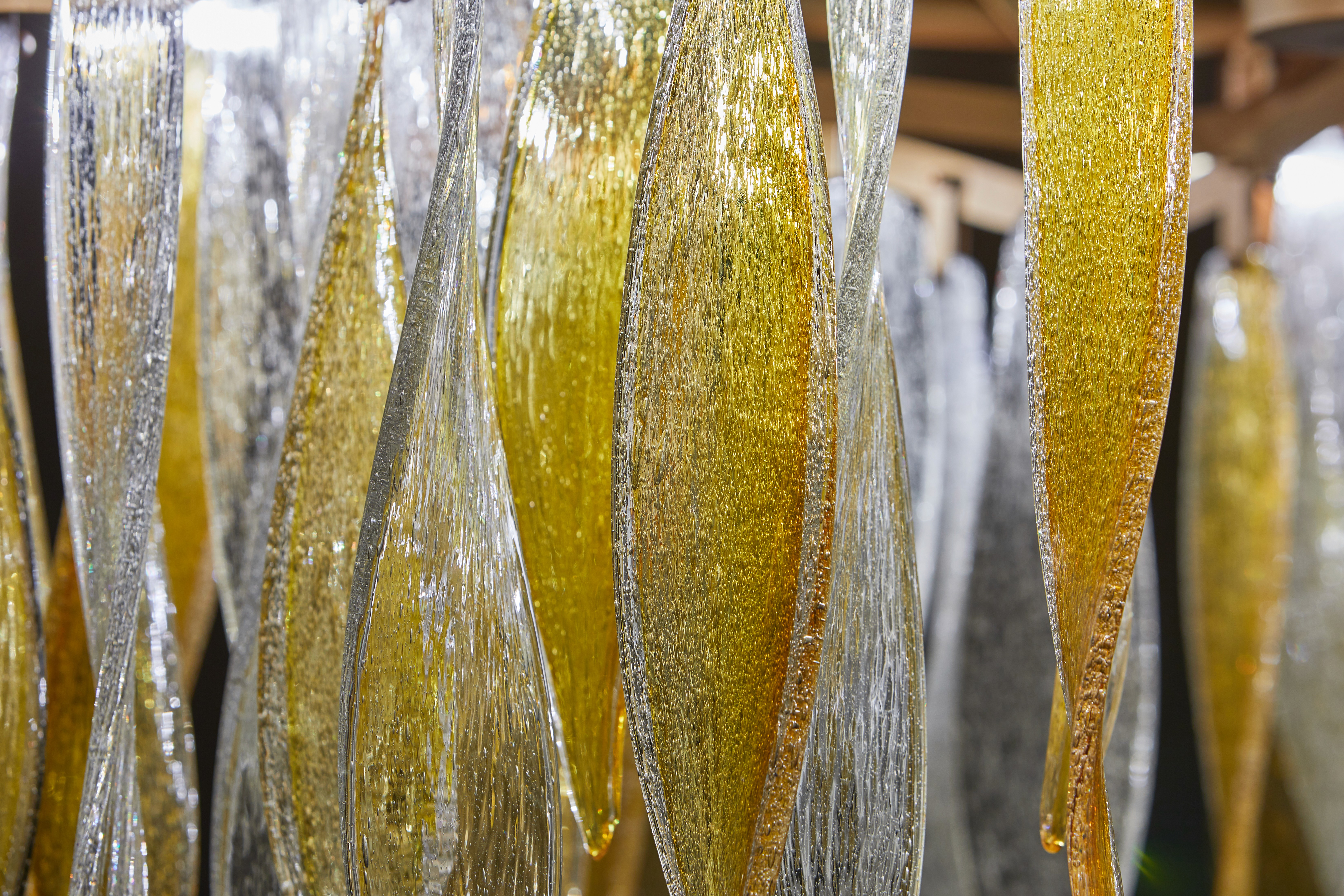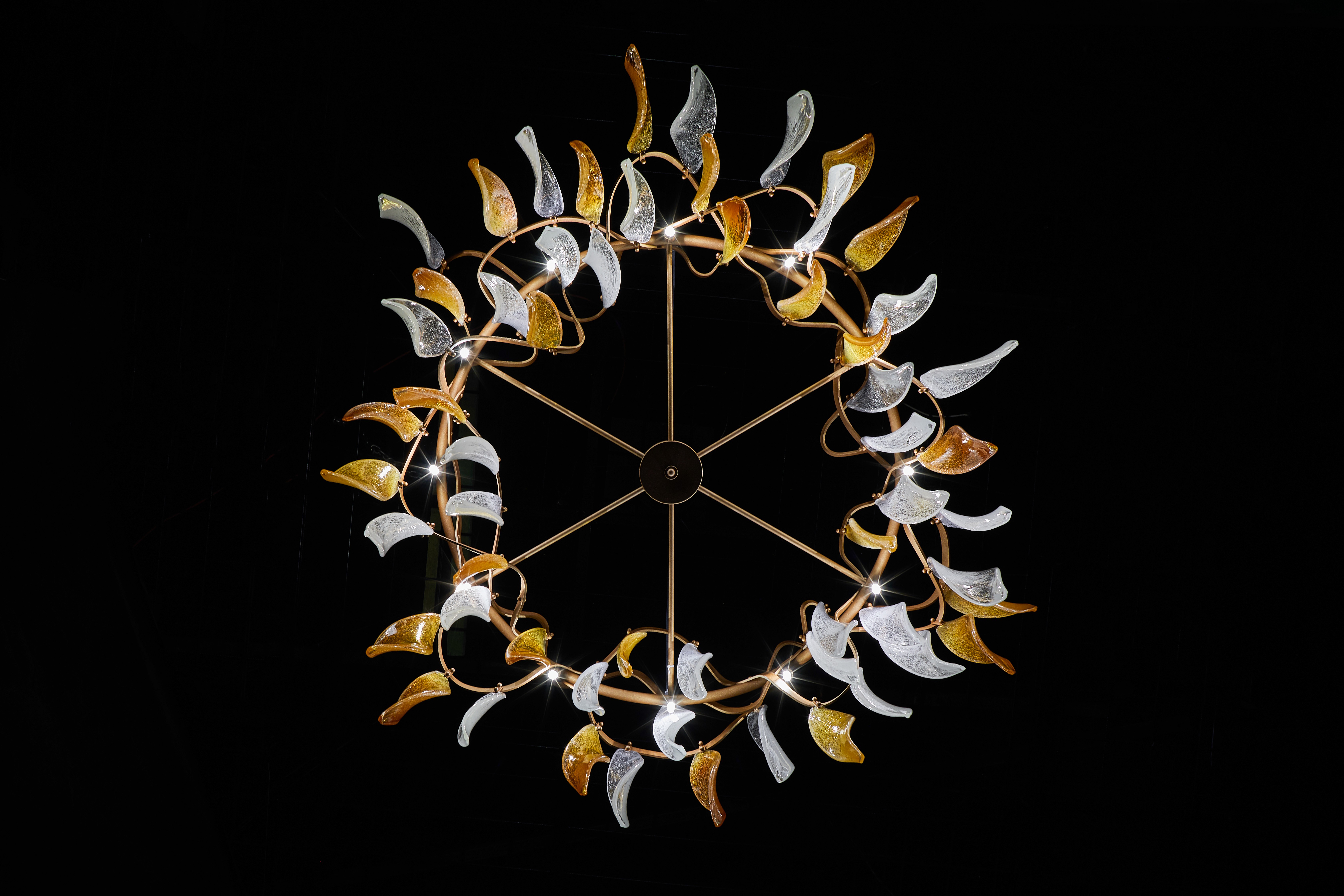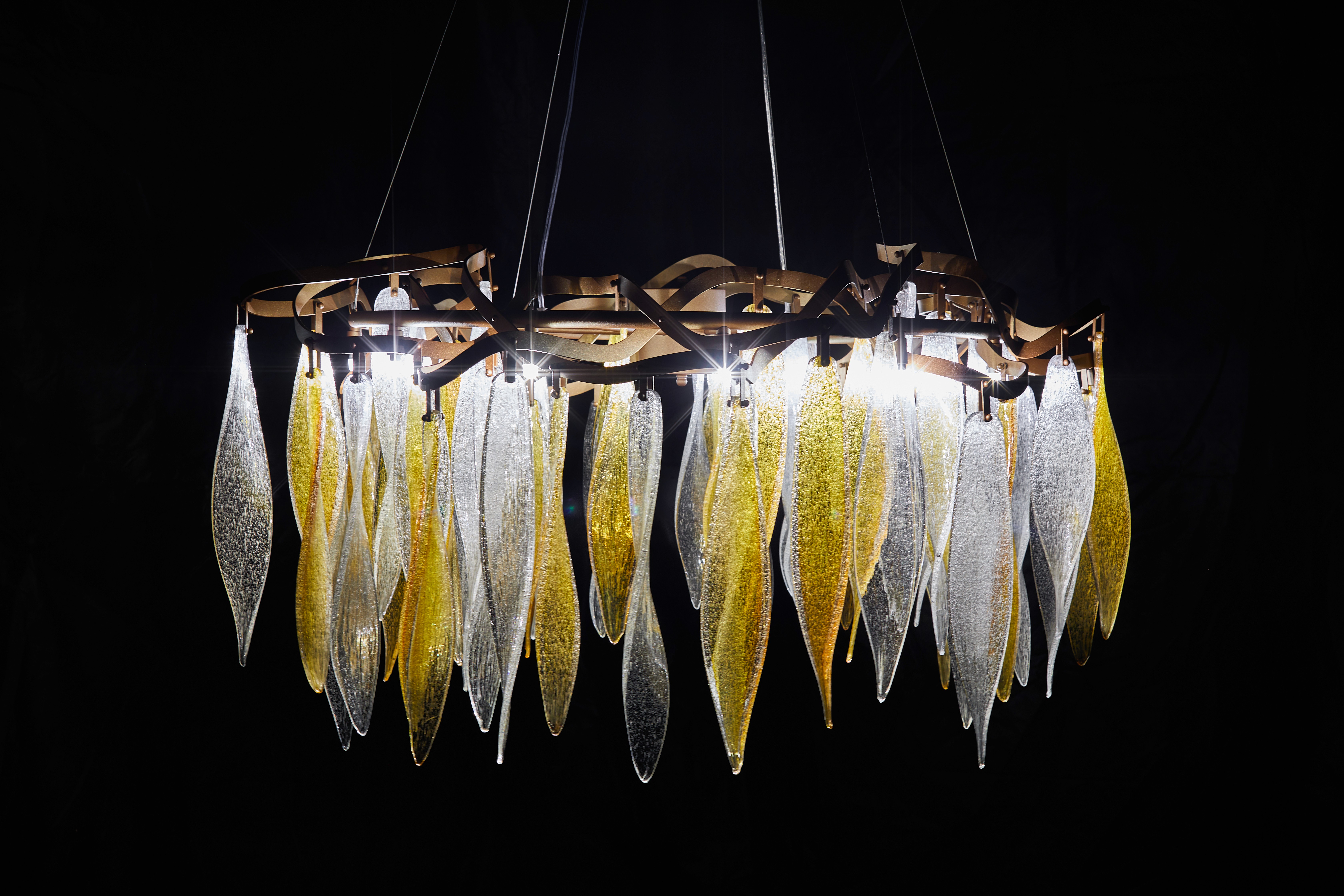 The first piece embraces an industrial aesthetic, combining a minimalist metal framework with hand-blown glass elements that resemble falling leaves, creating a sense of movement and lightness. In contrast, the second design draws inspiration from Hindu-Javanese motifs, featuring intricate metalwork and sculpted floral details.